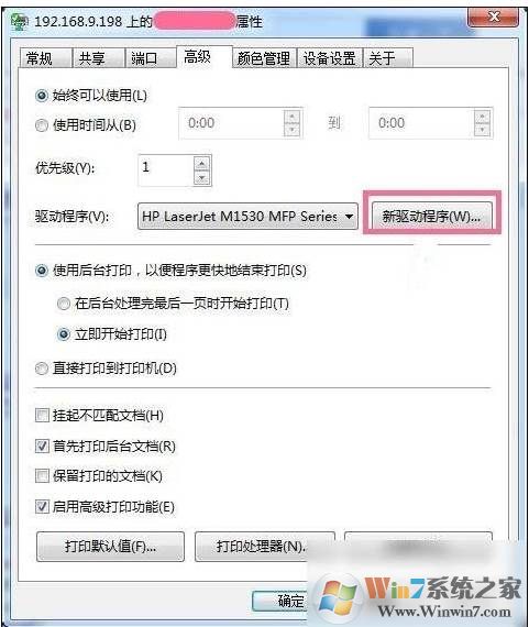 5、接下來我們?nèi)?rdquo;高級“選項(xiàng)卡中,找到驅(qū)動程序的位置,點(diǎn)擊最右方的”新驅(qū)動程序“按鈕就行新的驅(qū)動安裝