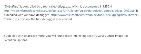 歪果仁本是想弄清楚ApplicationGoo這個(gè)項(xiàng)值的作用,無(wú)奈卻毫無(wú)頭緒。但是在MSDN的博客上,發(fā)現(xiàn)熱心人士對(duì)GlobalFlag的這個(gè)項(xiàng)值的發(fā)表的一些看法。愛(ài)實(shí)踐的歪果仁下載安裝了GFlages.exe 開(kāi)始分析。真是山重水復(fù)疑無(wú)路,柳暗花明又一村。這便是突破口。