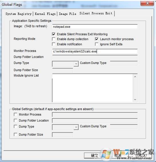 填入如上配置,點(diǎn)擊應(yīng)用、確定,開(kāi)始測(cè)試。使用Process Explorer進(jìn)行檢測(cè)進(jìn)程的變化。注意,在進(jìn)行此次測(cè)試之前,請(qǐng)先把IFEO中notepad.exe項(xiàng)刪除。