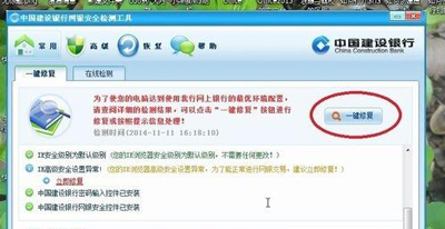 2、安裝后,打開檢測軟件,將目前系統(tǒng)存在的問題“一鍵修復(fù)”一下,如果交易時還是出現(xiàn)那個提示框,那么請選擇“一鍵檢測”,這時執(zhí)行的是在線的環(huán)境檢測,觀察是否有存在問題;
