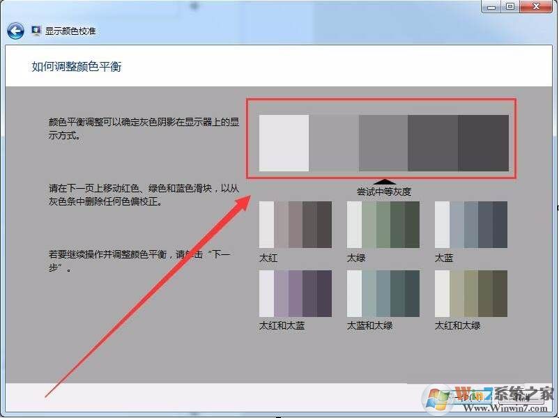 7、接下來(lái)調(diào)整伽瑪色,需要調(diào)整顯示器顯示與中間的畫(huà)面一致,單擊下一步。