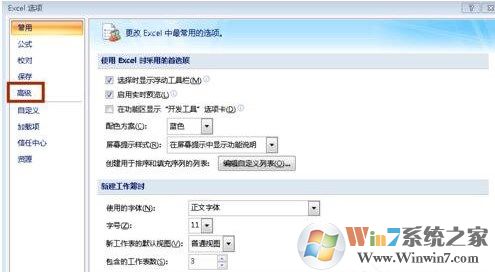 2、在Excel選項(xiàng)對(duì)話框中,點(diǎn)左側(cè)的“高級(jí)”。