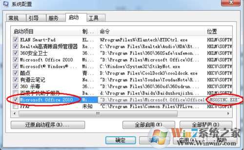 2、打開系統(tǒng)配置窗口。 在系統(tǒng)配置窗口中,點(diǎn)擊啟動(dòng),切換到啟動(dòng)界面,在啟動(dòng)項(xiàng)目中找到Microsoft Office 2010,有可能有多個(gè)Microsoft Office 2010,再查看相應(yīng)的命令中帶有MSOSYNC.EXE的,取消此啟動(dòng)項(xiàng)目,并確定退出系統(tǒng)配置窗口,然后重啟電腦。重啟電腦后發(fā)現(xiàn)任務(wù)欄中就不會(huì)有上載中心的圖標(biāo)了。