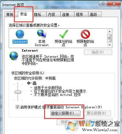 2、點(diǎn)擊“安全”進(jìn)入“Internet”點(diǎn)擊“自定義級(jí)別”。