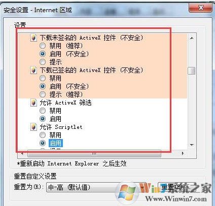 3、在“對(duì)標(biāo)記為可安全執(zhí)行腳本的ActiveX控件執(zhí)行腳本”后點(diǎn)擊“啟動(dòng)”,在“對(duì)未標(biāo)記為可安全執(zhí)行腳本的ActiveX控制初始化并執(zhí)行腳本(不安全)”。
