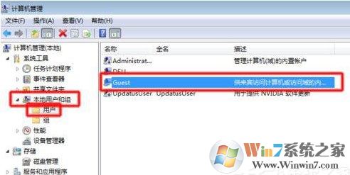 3、在彈出的對(duì)話框中選擇“本地用戶和組”→“用戶”→“Guest”。