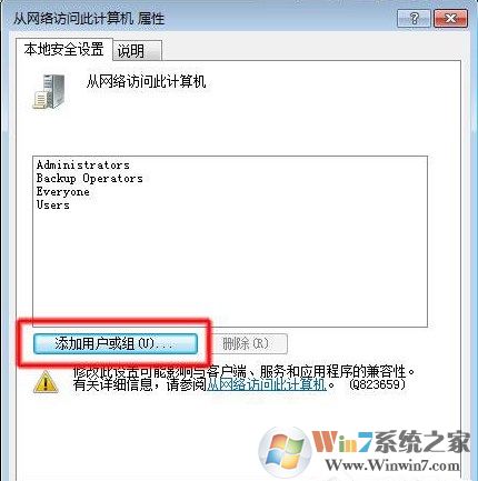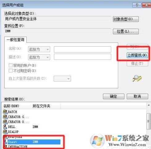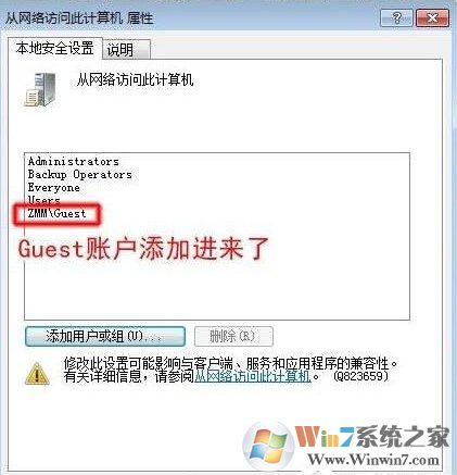 8、在彈出的“從網(wǎng)絡(luò)訪問(wèn)此計(jì)算機(jī)”的對(duì)話框中添加Guest用戶(方法為:添加用戶或組→高級(jí)→立即查找→Guest→確定即可。)