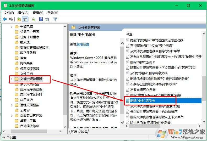 2、找到:用戶配置-管理模板-Windows組件-文件資源管理器,查看右側的位置如下圖,找到刪除安全選項卡;