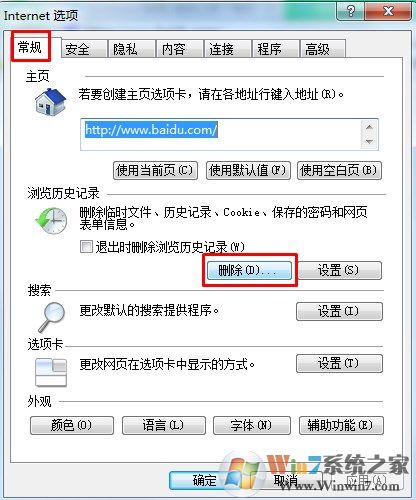 2、在【Internet 選項】里面,選擇【常規(guī)】,點擊【瀏覽歷史記錄】下面的【刪除】: