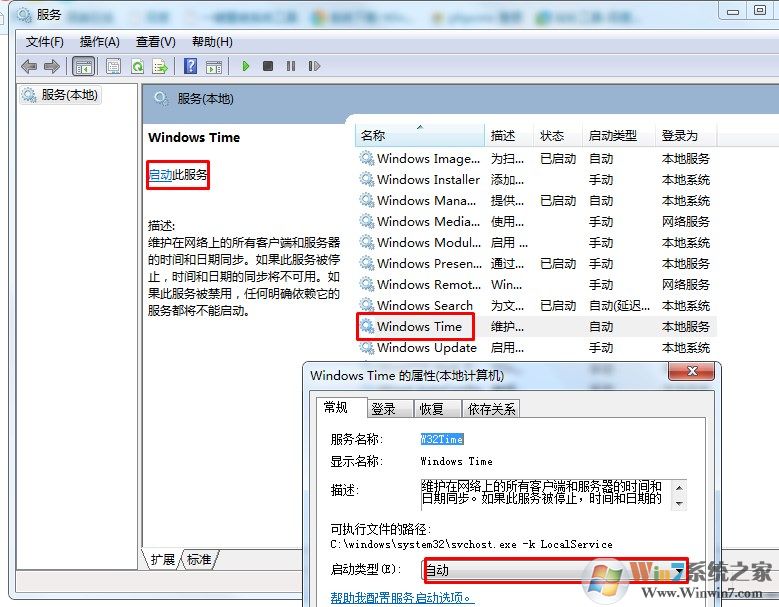 3、找到“Windows Time”服務(wù),選中并點擊“啟用”按鈕,開啟該服務(wù)。