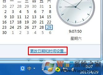 4、接下來點擊任務(wù)欄中的“時間”圖標(biāo),從打開的界面中點擊“更改日期和時間設(shè)置”按鈕。