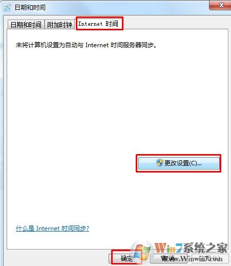 5、在打開的窗口中,切換至“Internet時間”選項卡,點擊“更改設(shè)置”按鈕。