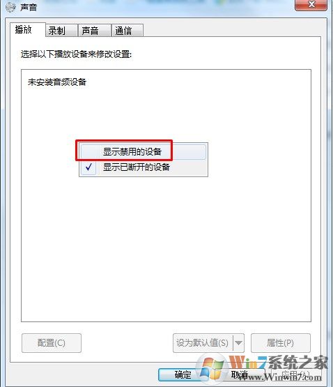 2、右鍵單擊:未安裝音頻設備,在出現(xiàn)的小窗口中,左鍵點擊:顯示禁用設備;