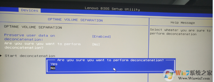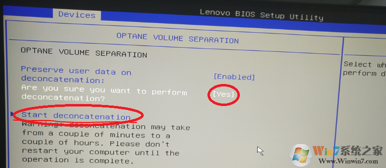5、選擇“Start deconcatenation”后,確認(rèn)如下圖所示,到此Optane Memory從Enable設(shè)置為Disable,按F10保存退出即可。