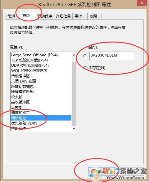 3、接著點(diǎn)擊【高級(jí)】-【網(wǎng)絡(luò)地址】-選【值】,填入一個(gè)新的網(wǎng)卡地址,這個(gè)地址必須是12位的,最后點(diǎn)擊確定mac地址就修改完成了,如下圖所示,我修改的新的mac地址是 0A-2B-3C-4D-5E-6F。