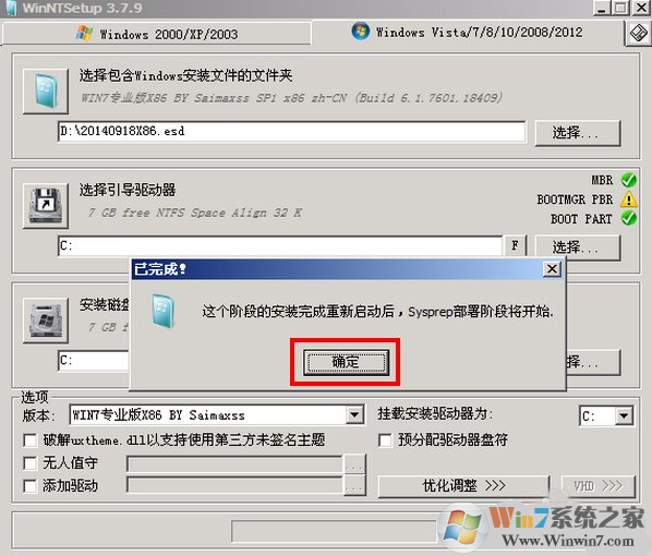 1、打開winntsetup,在“選擇包含windows安裝文件的文件夾”這里,點擊“選擇”找到你的ESD安裝文件。“選擇引導(dǎo)驅(qū)動器”默認(rèn)為C盤,“安裝磁盤的位置”是指你要把系統(tǒng)安裝到哪個盤,比如C盤,或者D盤等。下面的“選項”一欄有一個“版本”,是指的所要安裝的系統(tǒng)的版本,如果ESD文件中有多個版本的話,可以在這里進(jìn)行選擇。“掛載安裝驅(qū)動器”默認(rèn)為C盤。點擊“開始安裝”按鈕,準(zhǔn)備安裝系統(tǒng)。