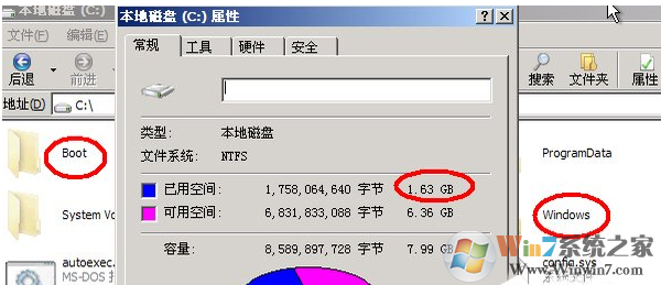 4、解壓縮完成后,我們看看C盤中已經(jīng)有了boot,windows等文件夾,解壓出來的文件大小為1.63GB.
