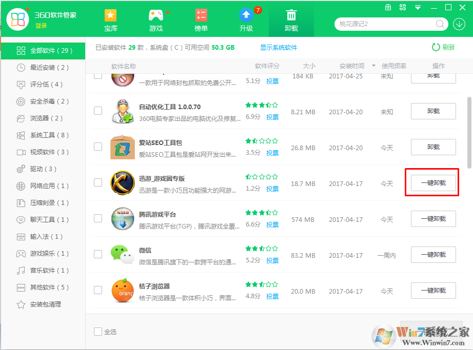 4、做好記錄之后開始卸載,這里小編推薦使用360軟件管家卸載,選擇一鍵卸載