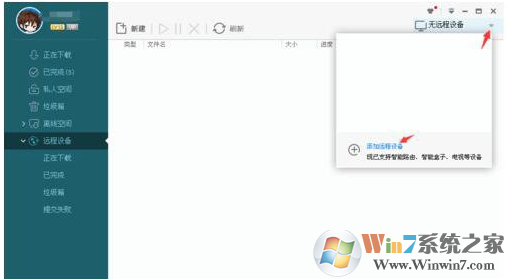 1、打開迅雷極速版下載,然后登陸迅雷賬號(hào),也可以先登陸,看一下面板下面有一項(xiàng)是遠(yuǎn)程設(shè)備,我的沒有呢要去添加,這時(shí)可以看右上角點(diǎn)擊無遠(yuǎn)程設(shè)備。