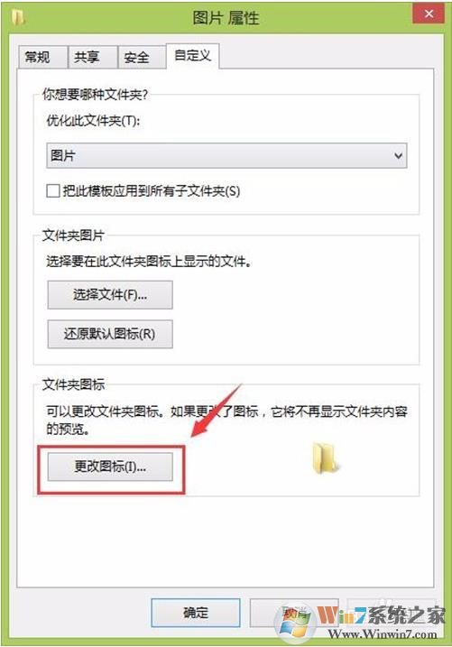 2、然后在文件夾屬性中,選擇 自定義,然后在下方點(diǎn)擊“更改圖標(biāo)”按鈕;
