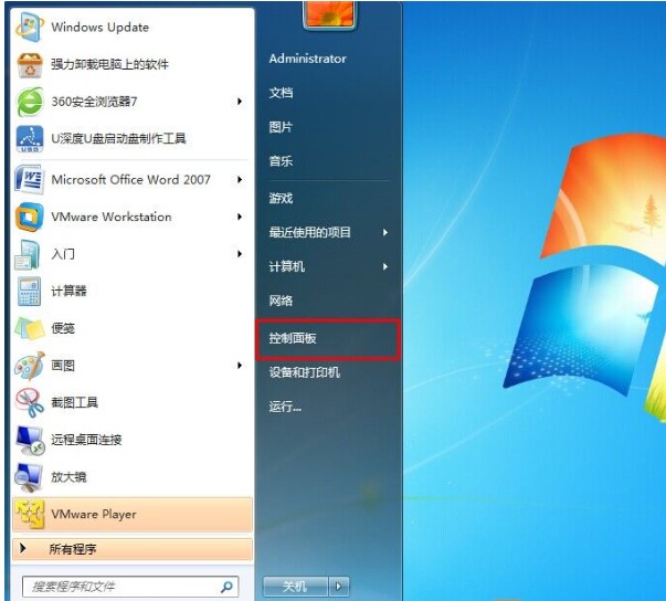 1、點(diǎn)擊在電腦屏幕左下角的“開始”菜單,選擇“控制面板”選項(xiàng)。如下圖所示: