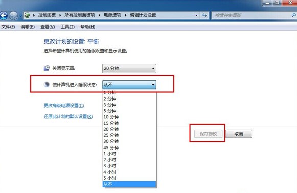 4、在“使計(jì)算機(jī)進(jìn)入睡眠狀態(tài)”菜單欄中,點(diǎn)擊下拉菜單將設(shè)置改為“從不”,最后點(diǎn)擊“保存修改”進(jìn)行保存。如下圖所示:(如果只是想讓時(shí)間更久一點(diǎn)才進(jìn)入待機(jī)狀態(tài),那么可以在下拉框中選擇你需要的時(shí)間。如1小時(shí))