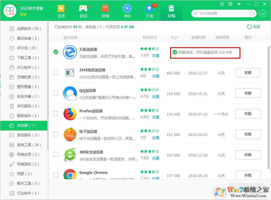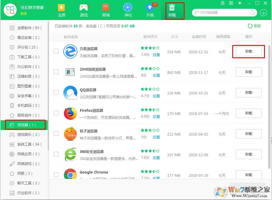 2、打開(kāi)軟件管家之后,點(diǎn)擊上面卸載,在左側(cè)分類中選中,瀏覽器,我們就可以在這里看到萬(wàn)能瀏覽器的卸載按鈕了。