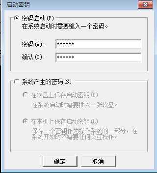4、在出現(xiàn)的“啟動(dòng)密鑰”窗口,點(diǎn)選“密碼啟動(dòng)(P)”,在“密碼”和“確認(rèn)”輸入框中輸入系統(tǒng)啟動(dòng)密碼,輸入完畢后點(diǎn)擊“確定”,如圖4所示: