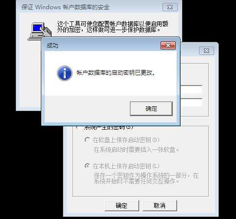 5.在出現(xiàn)的“賬戶數(shù)據(jù)庫(kù)的啟動(dòng)密鑰已更改”成功提示窗口中點(diǎn)擊“確定”,如圖5所示: