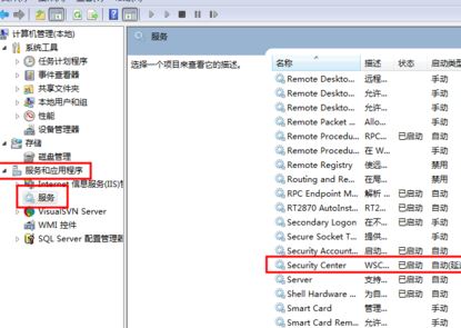 2、在打開的計算機管理界面 依次服務(wù)和應(yīng)用程序--》服務(wù) 找到Security Center服務(wù)選項 可以看到這個服務(wù)默認是啟動的,這個就是安全警告的對應(yīng)服務(wù),如圖: