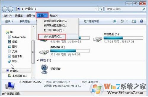 3、然后我們打開計(jì)算機(jī),然后選擇“文件夾選項(xiàng)”,如圖所示: