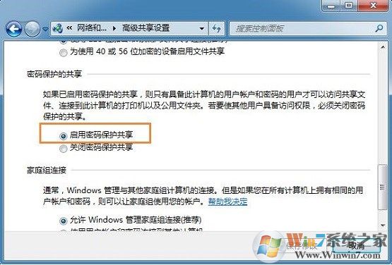 5、然后在出現(xiàn)的窗口中,在啟用密碼保護共享面前打鉤,點擊保存修改,下一次對方要訪問自己電腦共享之前,就需要輸入密碼才可以訪問了