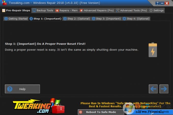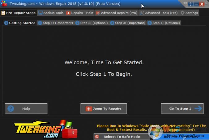 3、在預(yù)修復(fù)設(shè)置(Pre-Repair Setups)選項卡向?qū)О奈鍌€步驟中,實際上只有后四個是為預(yù)修復(fù)過程而設(shè)計的。點擊Go to Step 1開始修復(fù)前的準(zhǔn)備工作,首先要求進(jìn)行一次系統(tǒng)重啟,這時更建議啟動到安全模式,為此可點擊底部的Reboot To Safe Mode按鈕啟動到安全模式。