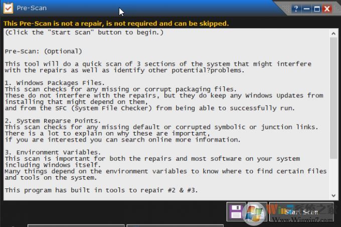 4、接著進(jìn)入預(yù)掃描環(huán)節(jié),會啟動預(yù)掃描窗口,主要會對Windows文件包、系統(tǒng)鏈接點、環(huán)境變量進(jìn)行掃描分析,點擊Start Scan進(jìn)行掃描,或可以分別選擇上述三者,如圖: