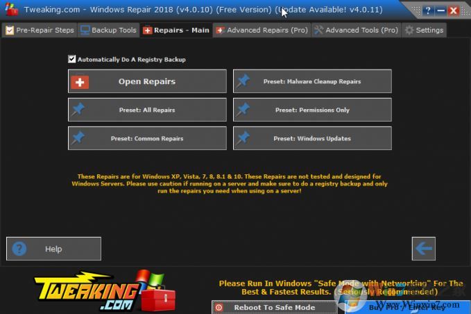 7、可以點擊Repair Main選項卡,進(jìn)行實質(zhì)性的修復(fù)選擇了。軟件默認(rèn)會啟用一個Automatically Do A Registry Backup選項,意思是在修復(fù)前先自動對注冊表進(jìn)行備份。在可選擇的6個修復(fù)模塊中,有5個預(yù)設(shè)模塊(Preset),分別可進(jìn)行自動進(jìn)行惡意破壞修復(fù)(Malware Cleanup Repair)、常規(guī)修復(fù)(Common Repair)、系統(tǒng)升級修復(fù)(Windows Updates)、僅修復(fù)許可項(Permissions Only)、修復(fù)所有(All Repair)等的項目選擇。