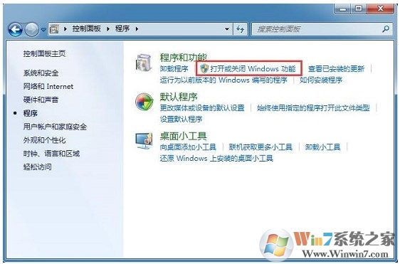 2、在打開的程序窗口,點(diǎn)擊程序和功能下面的“打開或關(guān)閉Windows功能”,如下圖所示: