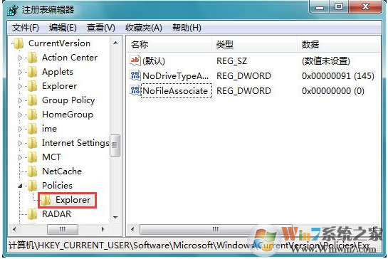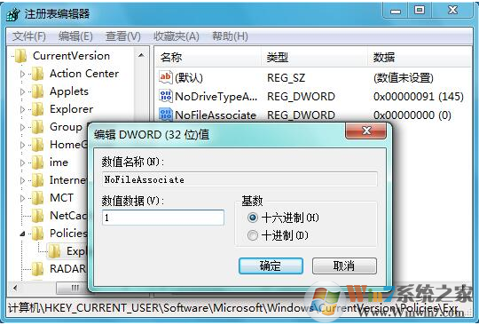 3、在右窗格中右擊“NoFileAssociate”(REG_DWORD型)選擇修改,在彈出的窗口中將其數(shù)值改為1(1表示:不允許用戶更改文件屬性,0表示:允許用戶更改文件屬性),點(diǎn)擊“確定”保存設(shè)置后退出注冊(cè)表。