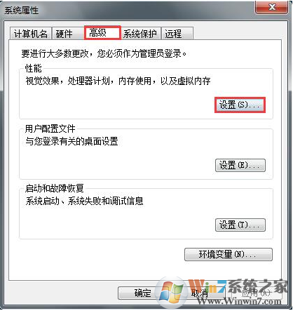 ?、垭S后彈出系統(tǒng)屬性窗口,在高級(jí)選項(xiàng)卡中,點(diǎn)擊性能設(shè)置選項(xiàng),如圖所示: