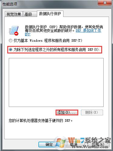 ?、茏詈笤谛阅苓x項(xiàng)窗口中,切換至數(shù)據(jù)執(zhí)行保護(hù)選項(xiàng)卡,點(diǎn)擊“為除下列選定程序之外的所有程序和服務(wù)啟用dep”并點(diǎn)擊下方的“添加”按鈕從硬盤中選中該程序即可,如圖所示: