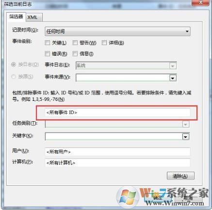 5. 比如我們要查看電腦近段時間的開關(guān)機(jī)時間,ID6005表示事件日志服務(wù)已啟動,即開機(jī)。ID6006表示事件日志已停止,即關(guān)機(jī),那么就在輸入ID處輸入“6005,6006”,點(diǎn)擊確定:
