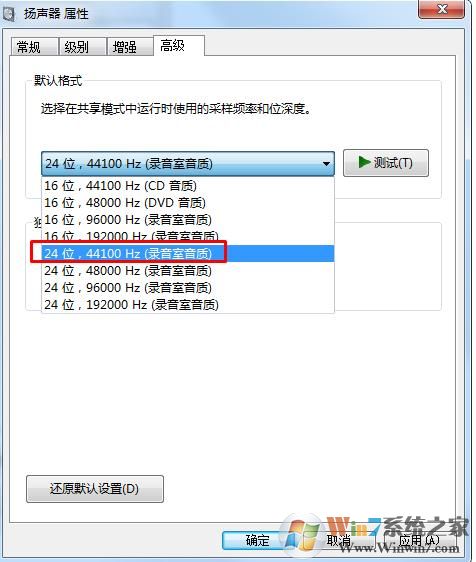 3、在高級中,選擇為 24位 44100HZ錄音室音質(zhì)。