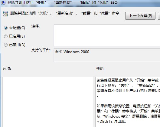 3、在右側(cè)雙擊打開:刪除和阻止訪問“關(guān)機(jī)”、“重新啟動”、“睡眠”和“休眠”命令 點(diǎn)擊“未配置”,點(diǎn)擊應(yīng)用并確定即可;