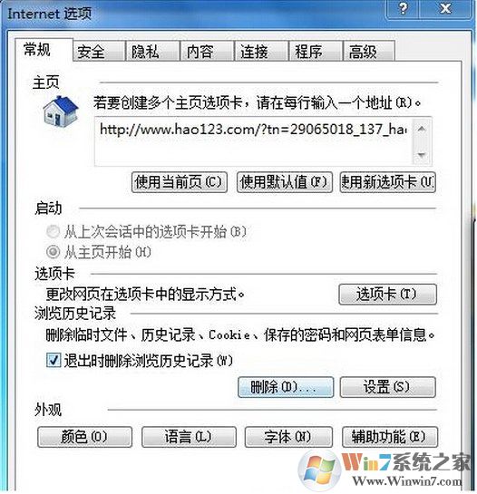 二、所以需要進(jìn)行及時的清理系統(tǒng)瀏覽器緩存。即在Win7系統(tǒng)IE瀏覽器上,點(diǎn)擊菜單欄上的“工具”-“Internet選項”,然后點(diǎn)擊“刪除”歷史記錄,將Win7系統(tǒng)IE瀏覽器上的歷史記錄進(jìn)行清空。