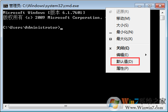 1、在命令提示符的窗口邊上右擊,點(diǎn)擊“默認(rèn)值”,如下圖;