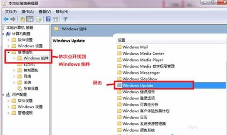 7.依次點(diǎn)開(kāi)左邊欄,找到管理模板/Windows組件,找到Windows Update,雙擊