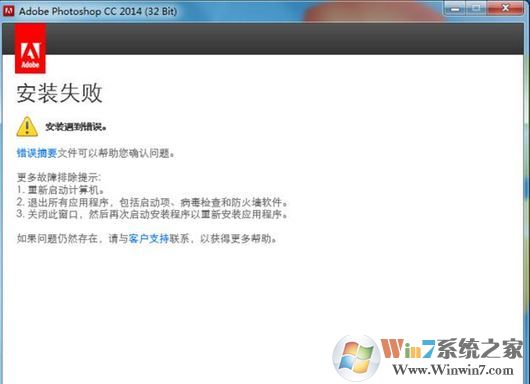 win7系統(tǒng)ps安裝失敗怎么辦?當我們在win7旗艦版操作系統(tǒng)中想要使用ps進行制圖在電腦中安裝了ps之后卻無法正常安裝,遇到了安裝失敗的現(xiàn)象,針對這樣的問題該怎么辦呢? 安裝遇到錯誤。 錯誤摘要文件可以幫助您確認問題,針對這樣的問題通常情況下我們在win7旗艦版操作系統(tǒng)無法正常安裝失敗導致的,下面winwin7小編給大家分享介紹下ps安裝失敗修復方法。