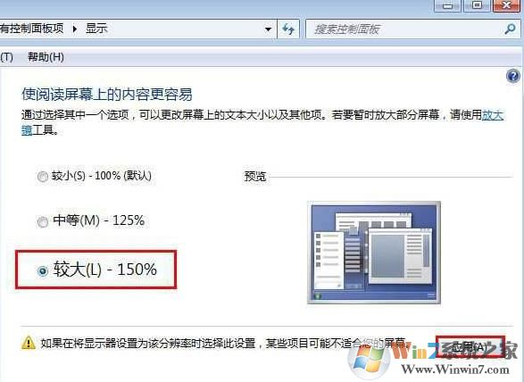 3、 打開(kāi)“顯示”面板后,我們就可以選擇字體放大倍率了,默認(rèn)是100%,按自己的需求選擇即可,選擇完畢后點(diǎn)擊應(yīng)用;