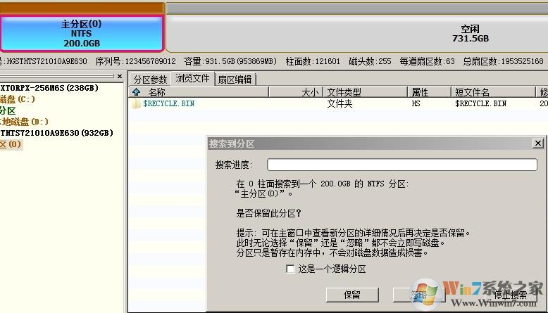 4、在搜索過程當出現(xiàn)“搜索到分區(qū)”對話框的時候,如果顯示的分區(qū)類型和大小是之前對應(yīng)分區(qū)的類型和大小,則點“保留”,如果不是,則點“忽略”