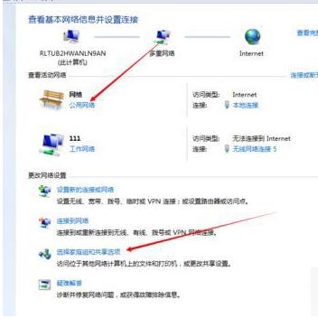 2、記住此處的網(wǎng)絡(luò)類型,后面要用。選擇“家庭組和共享設(shè)置”;
