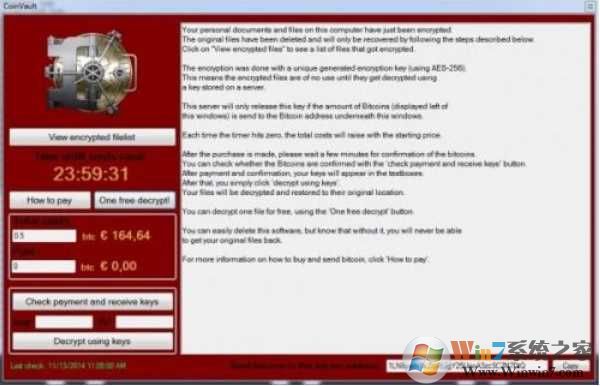 CoinVault病毒在 2014 年 5 月被發(fā)覺,感染了全球一百多個(gè)國家的大量用戶,在 2015 年 4 月,荷蘭警方從CoinVault服務(wù)器接貨了解密密鑰的數(shù)據(jù)庫,隨后卡巴斯基推出免費(fèi)的解密服務(wù)。然而CoinVault的作者隨后更新了密鑰,推出第二代病毒Bitcryptor,在上個(gè)月兩名相關(guān)嫌疑人被荷蘭警方逮捕,新的解密密鑰再次被警方截獲。